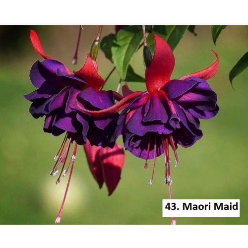 Maori Maid -крупноцветковая фуксия с красочными махровыми цветками, обильным и продолжительным цветением. Чашелистики тёмно–красные (тёмно-розовые), юбочка сине–фиолетовая с красными мазками. Высота куста: 15-25см Форма куста: ампельный.