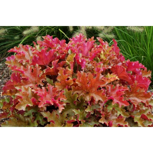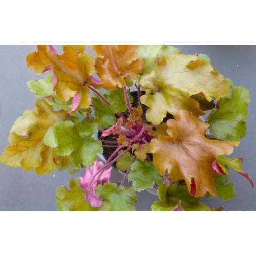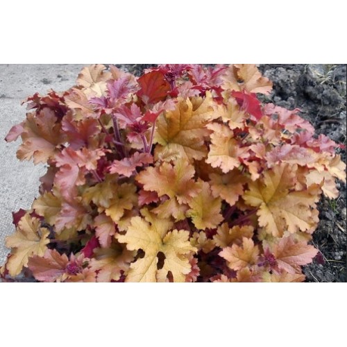 Один из самых популярных сортов! Мармелад отличается богатой солнечной палитрой: желто-оранжевой, янтарной, ярко-желтой, красно-медной. Листва плотная, сильно гофрированная. Сорт-хамелеон, меняющий в течении сезона окраску листьев от ранневесенней розовой к медно-бронзовой, с оттенками жёлтого и зелёного. Их оборотная сторона ещё более колоритна – она ярко-розовая!