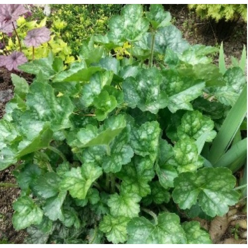 Листья среднего размера, в форме кленового листа, нежно-зеленого цвета с темными прожилками и легким серебристым напылением.
