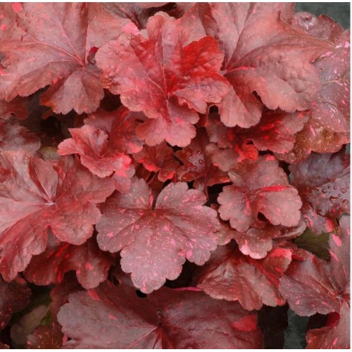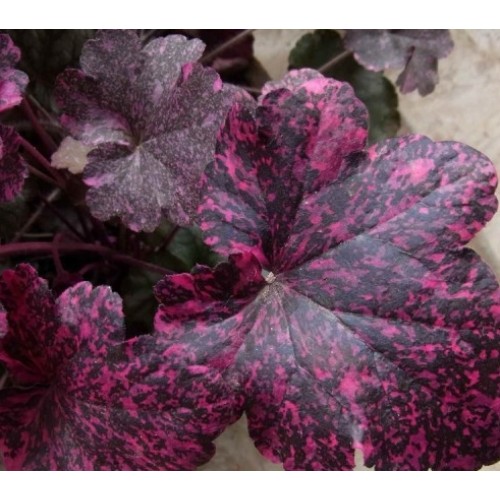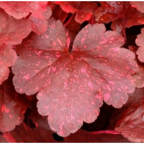 Гейхера Galaxy - новинка, гибридная крапчатая гейхера. Листья очень большие, блестящие, кожистые, с ярко-розовыми пятнами по всей поверхности листа. Весной листья красные, затем постепенно приобретают красно-коричневый оттенок, а "брызги" светлеют и становятся более заметны. Цветки бледно-розовые.
