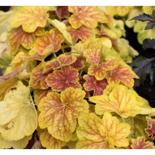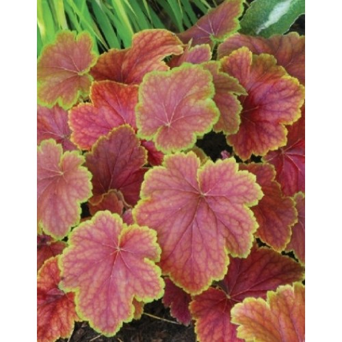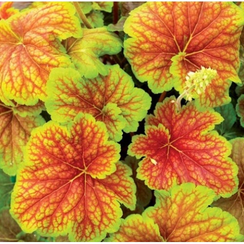 Очень нарядный, компактный и не капризный сорт гейхеры. Может расти на солнечном месте, но окраска листьев в этом случае немного блекнет. Изменяет окраску в течении сезона. Цвет листьев меняется от лаймового с красными прожилками до красного цвета с золотисто-жёлтой каймой по краям. Цветки белые.
