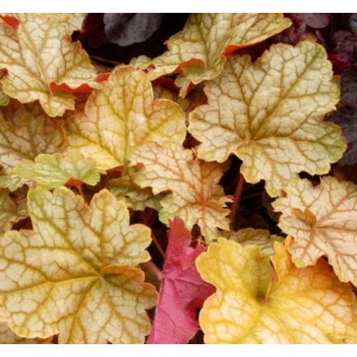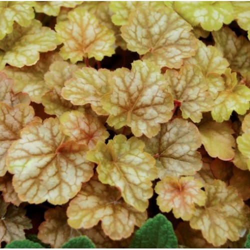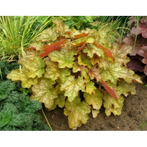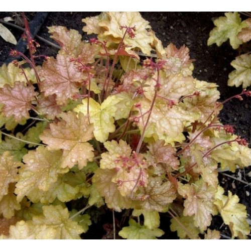 Листья замечательного янтарно-имбирного цвета c серебристым напылением, нижняя сторона листа розовая. Цветы желтые.