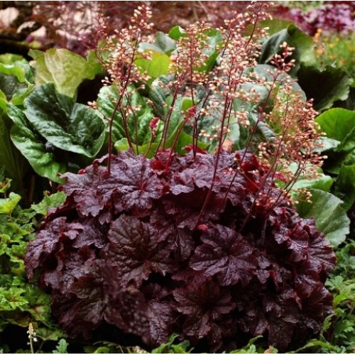 Устойчивая к жаре и холоду гейхера-хамелеон, трижды за сезон меняющая окраску. Листья ярко-коралловые весной, красно-коричневые летом, фиолетово-бордовые осенью. Большие, гофрированные, плотные, кожистые листья образуют восхитительный куст.