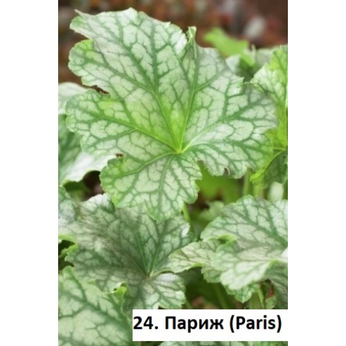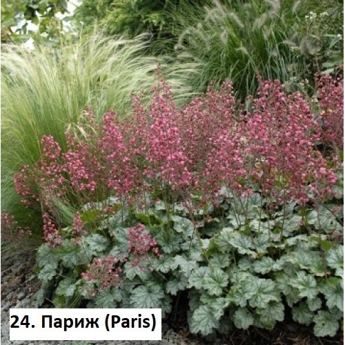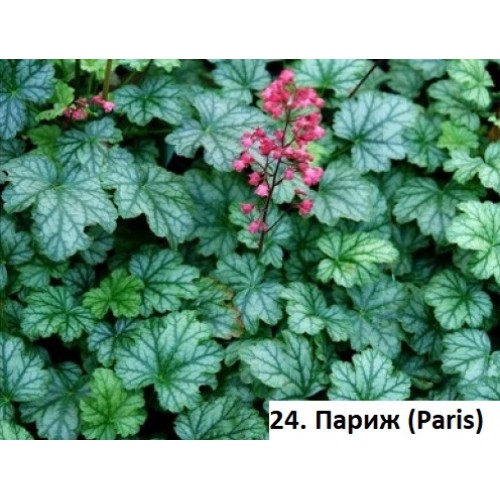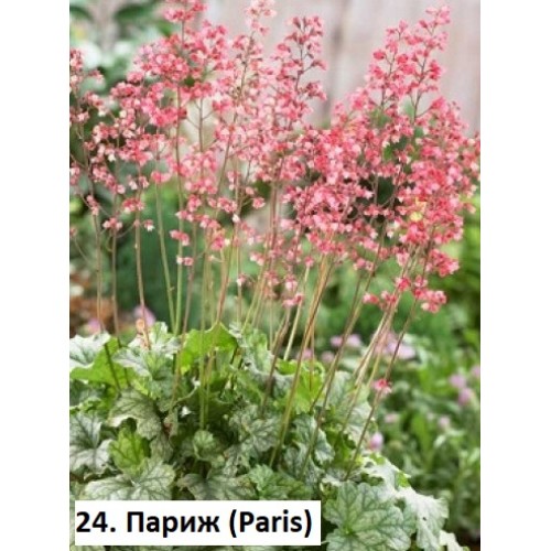 Эффектность гейхере Париж придают ярко-розовые высокие цветы. Цветет в июне-июле; цветки многочисленные, мелкие, колокольчатые, окрашены в ярко-розовый (коралловый) цвет.