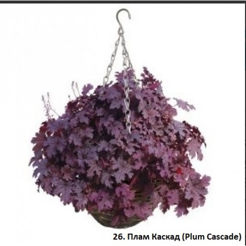 Эффектная резная листва сохраняет свой благородный цвет в течении всего сезона. Светло-розовые цветки на невысоких цветоносах выигрышно смотрятся на фоне более темной листвы. Сорт Плюм Каскад отличается быстрым ростом. Благодаря ампельной форме, с успехом может выращиваться в подвесных кашпо, а также использоваться как почвопокровное растение, которое быстро покрывает большие площади и имеет высокую декоративность длительное время.